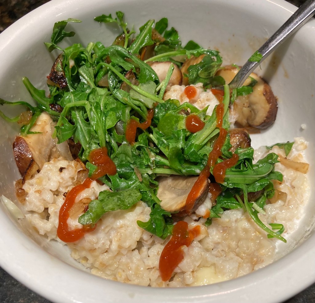 Add mushroom mixture, half and half, cheese to oatmeal. Stir until cheese is melted. Top with your favorite greens. If you need extra spice add some Texas Pete’s or Siracha. Eat up!